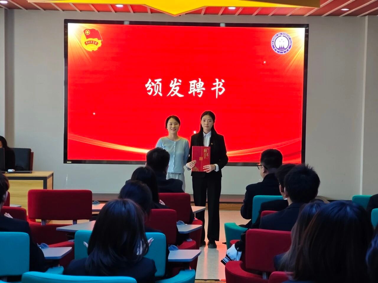 学生工作处思想教育科商竞丹老师为协会会长——会计与审计学院24403班白梦寒同学颁发聘书,传递学校对协会发展的殷切期望。